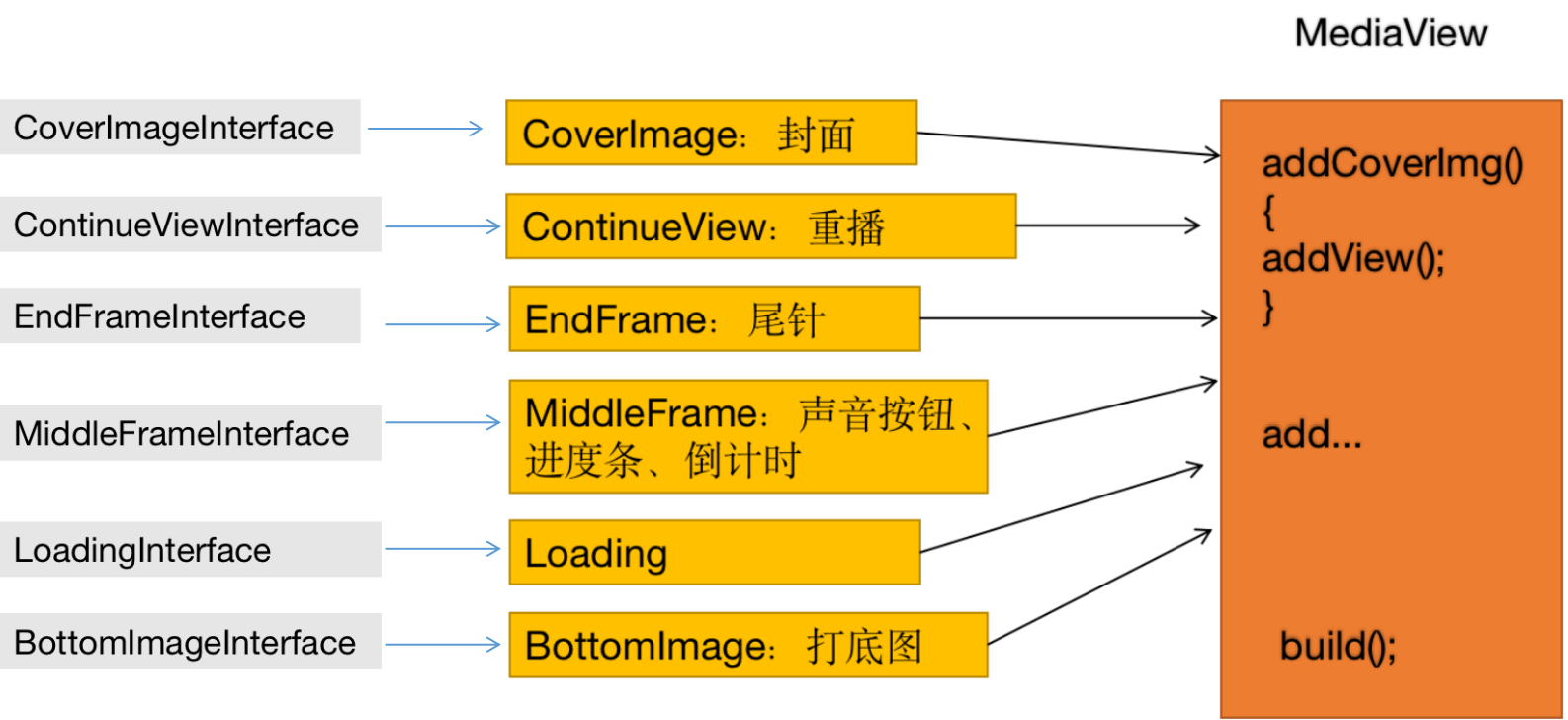 这里将我们所有组件根据业务功能划分成了6个大组件。在new每个MediaView的时候通过set不同组件实现不同功能需求的MediaView。也很好的确保了每个MediaView只包含相应功能的组件,减少冗余。下面是代码: